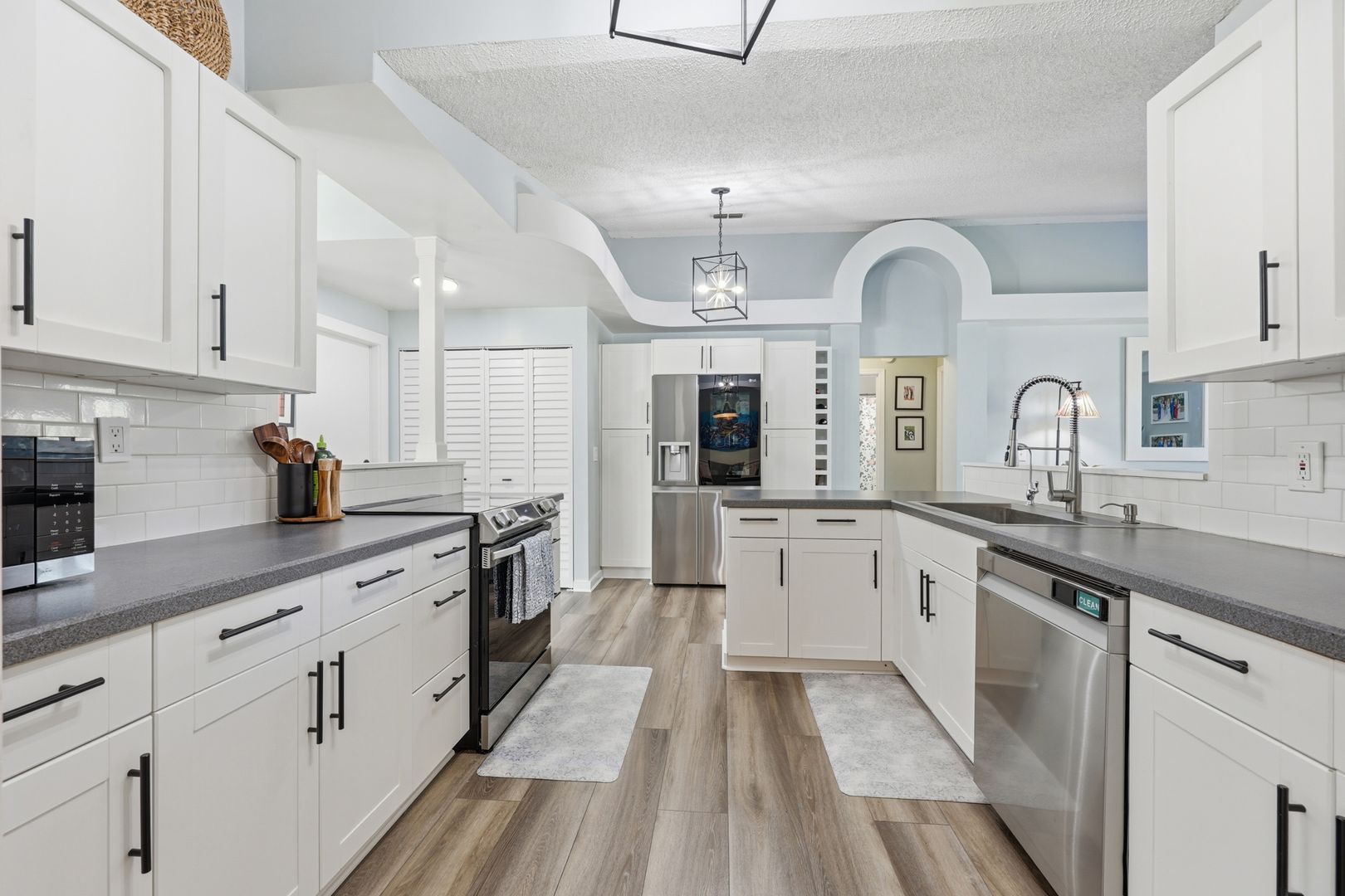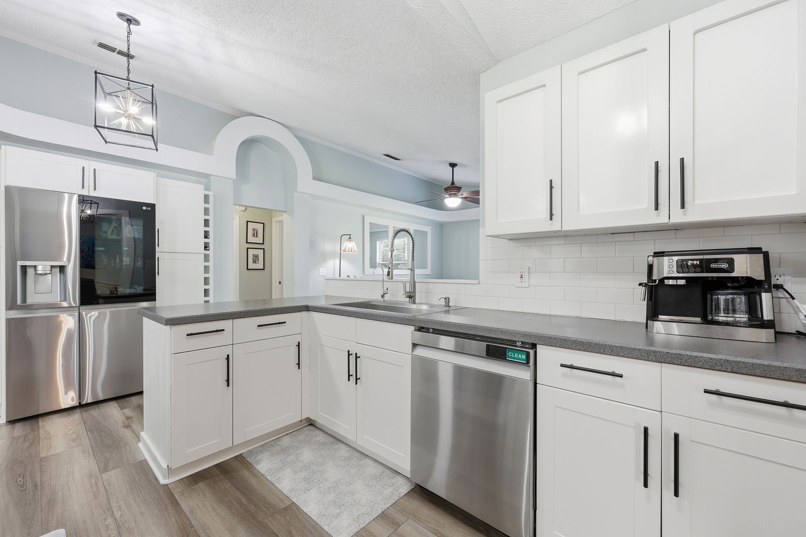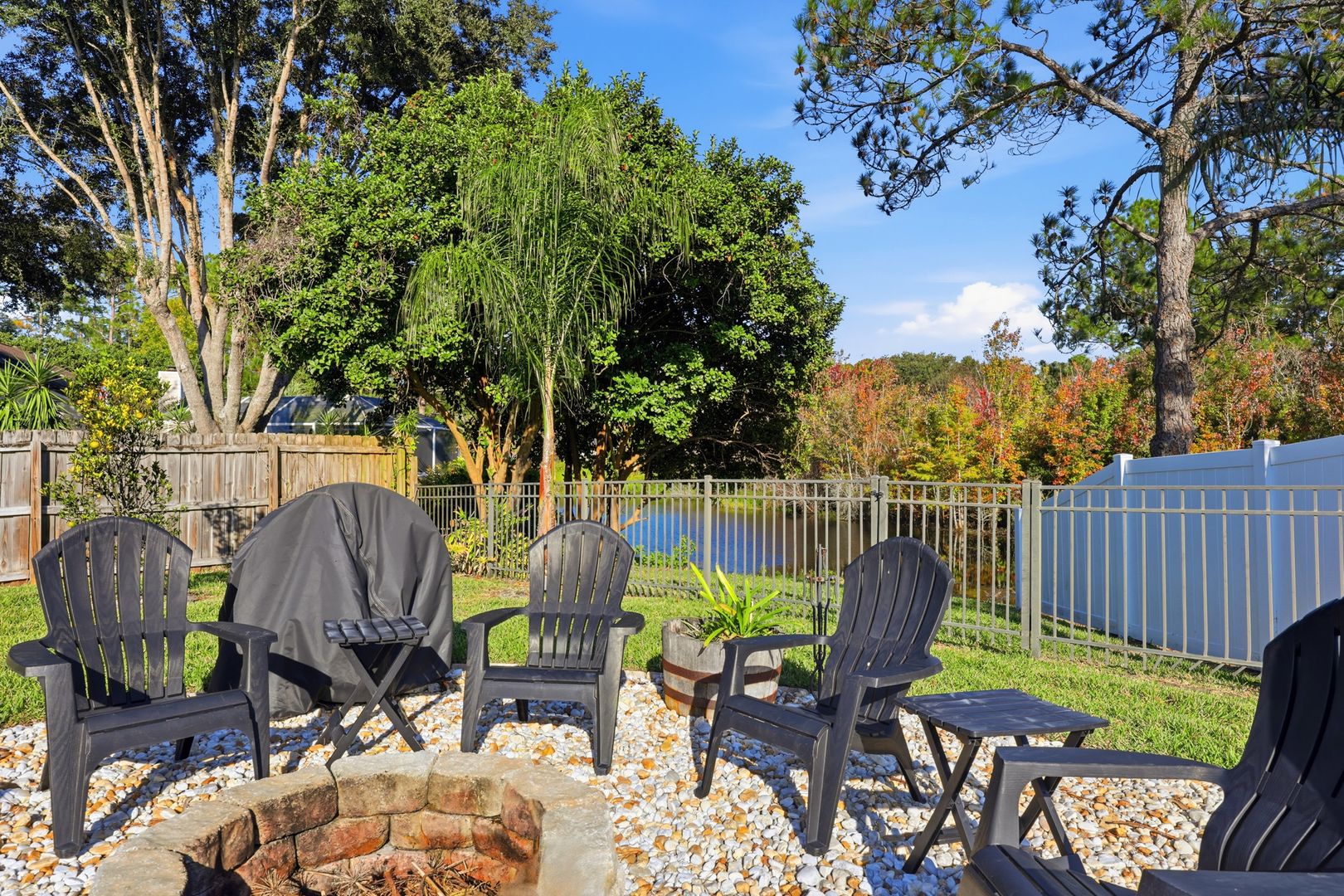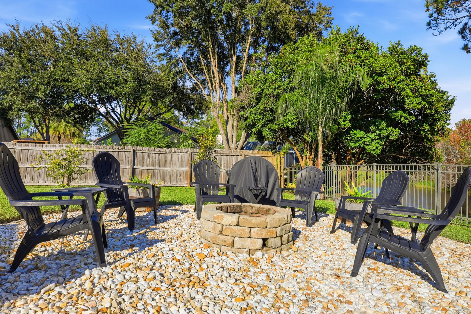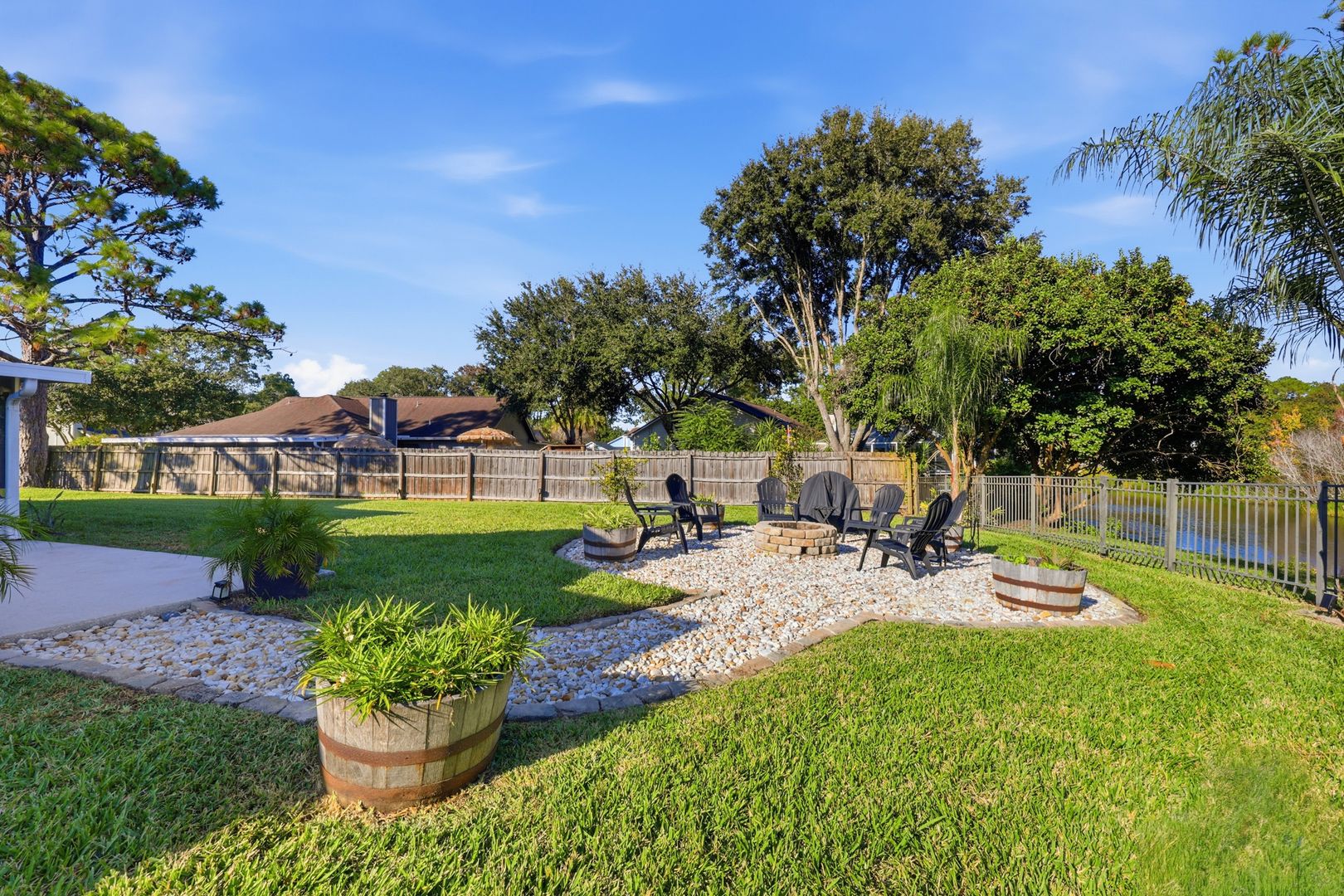 Come live on a private cul-de-sac with an enormous, fenced back yard and incredible water view! This three bedroom home has been meticulously maintained and updated over the past few years. There is durable LVP flooring throughout, beautiful light fixtures and window treatments in each room. The kitchen features a double door fridge with ice and water dispensers, electric range, dishwasher and microwave. Brand new washer and dryer with 5 year warranty. The kitchen overlooks one of two living areas and a separate, private dining area. The second living area features a built in bar with beverage cooler and extra cabinet space. This home is a split floor plan. The primary easily fits a king sized bed, walk in closet and a recently updated primary bath with newer vanity, light fixtures and a walk in shower. The other two bedrooms are located on the opposite end of the home and share a bathroom. The large screened in porch is perfect for relaxing while overlooking the massive backyard. There is a uniquely designed firepit with gravel walkway and lush greenery. Amenities in the neighborhood include a huge pool, tennis/pickleball courts, basketball courts and a playground. Call to experience this beautiful home today!