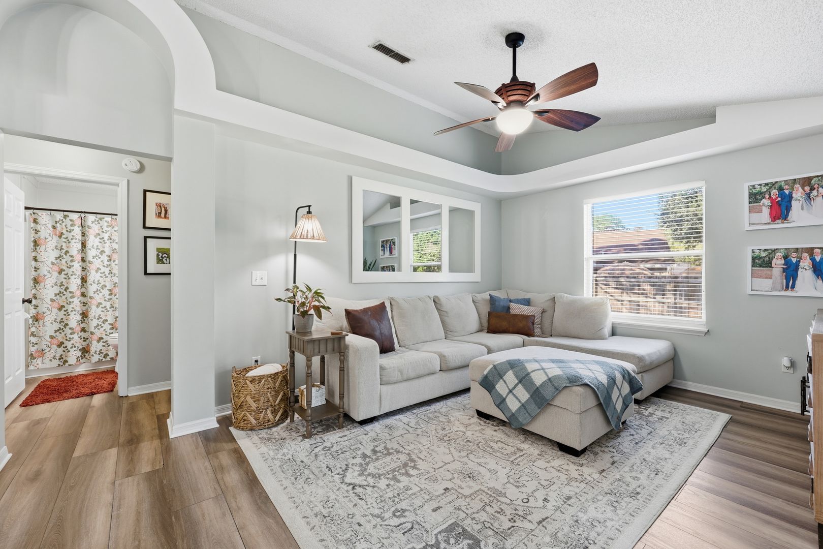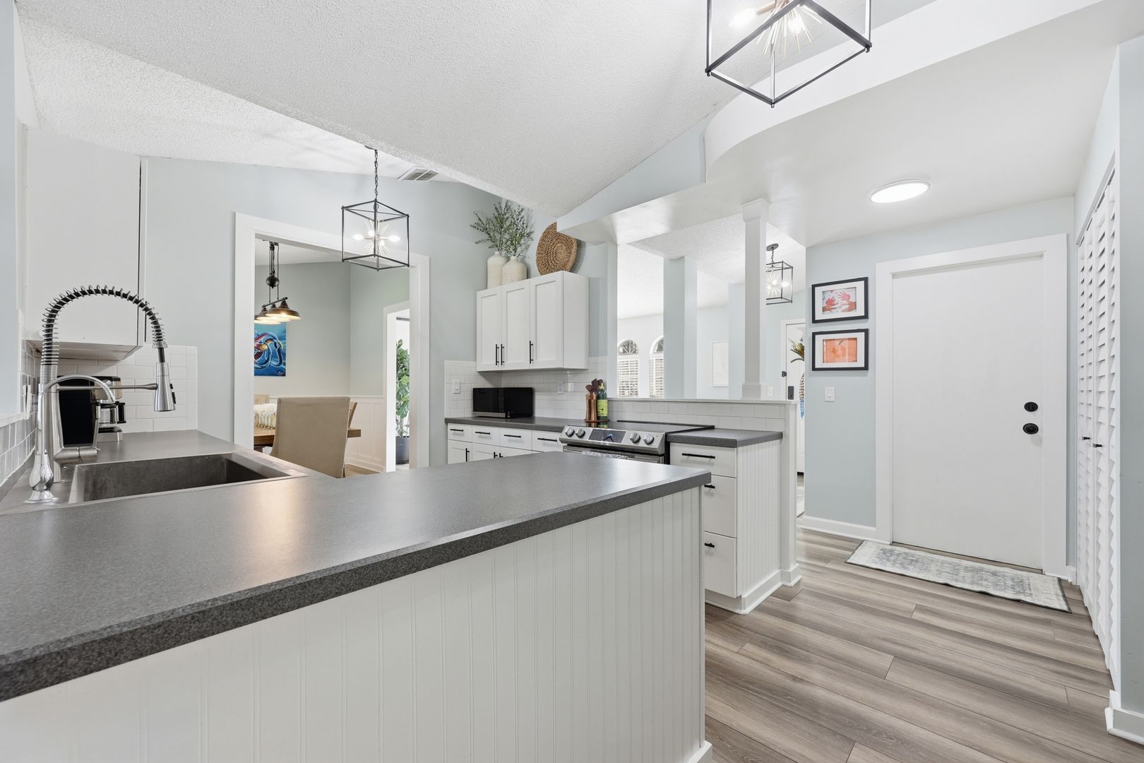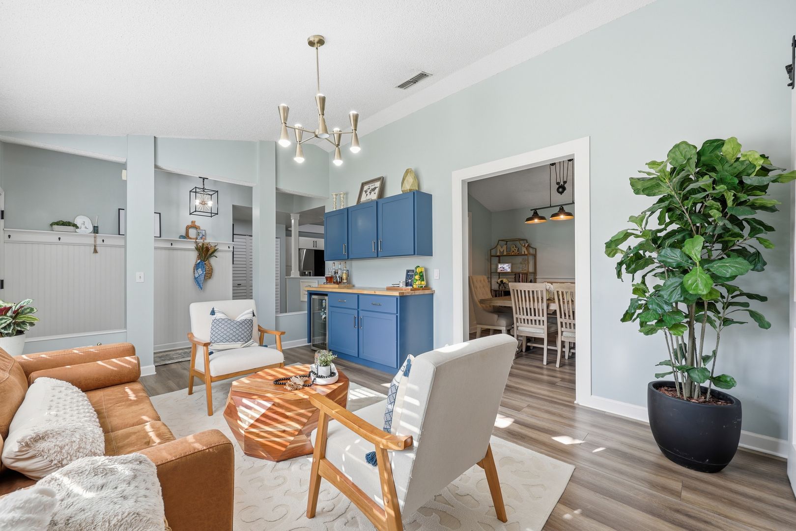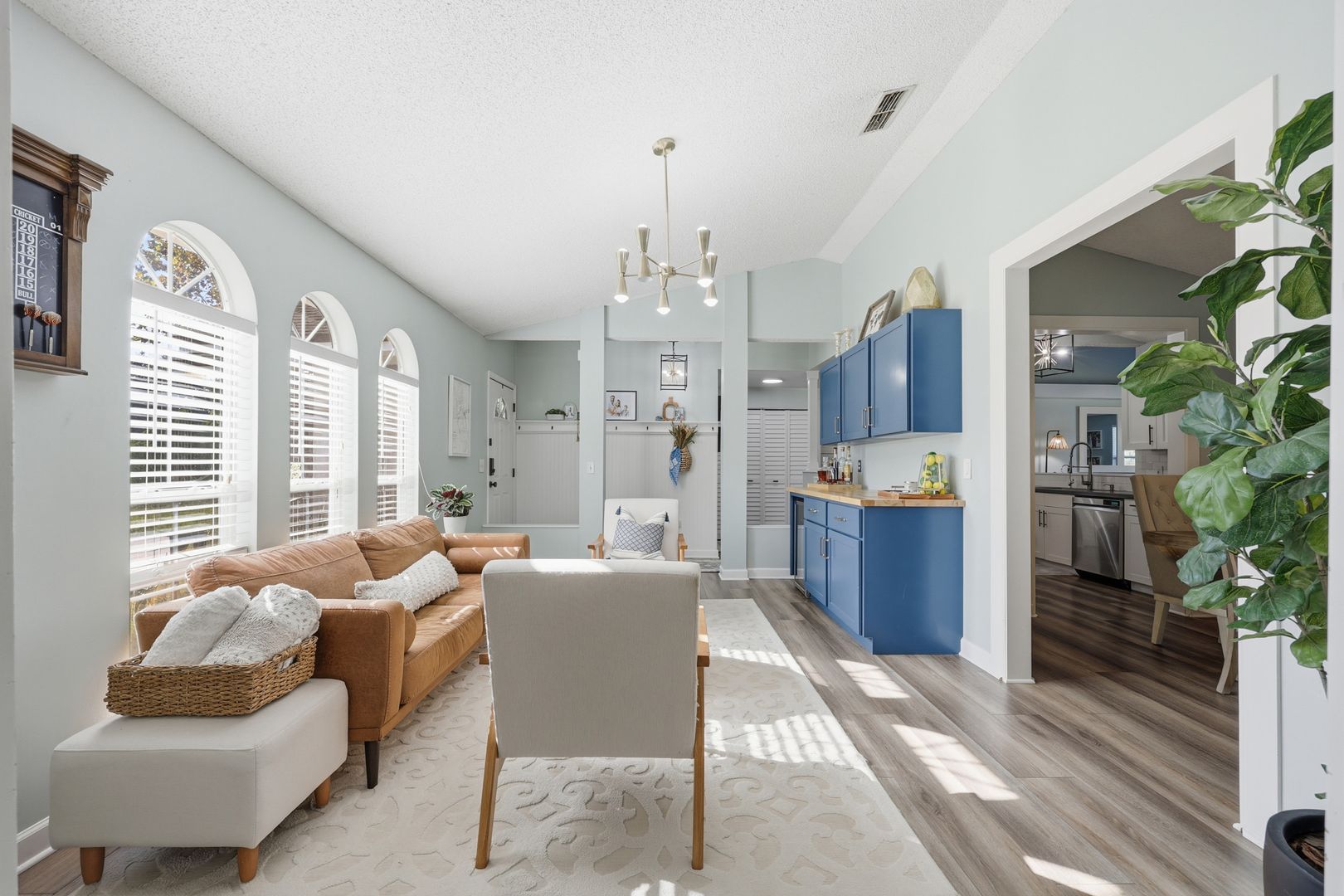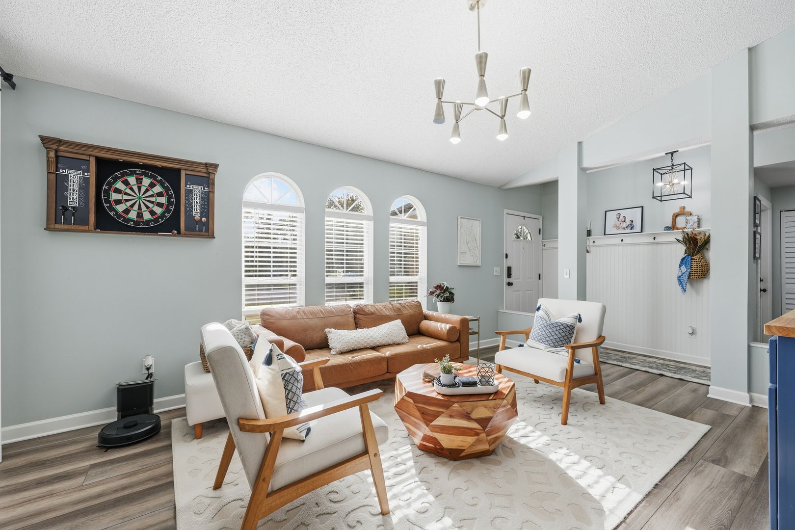 Come live on a private cul-de-sac with an enormous, fenced back yard and incredible water view! This three bedroom home has been meticulously maintained and updated over the past few years. There is durable LVP flooring throughout, beautiful light fixtures and window treatments in each room. The kitchen features a double door fridge with ice and water dispensers, electric range, dishwasher and microwave. Brand new washer and dryer with 5 year warranty. The kitchen overlooks one of two living areas and a separate, private dining area. The second living area features a built in bar with beverage cooler and extra cabinet space. This home is a split floor plan. The primary easily fits a king sized bed, walk in closet and a recently updated primary bath with newer vanity, light fixtures and a walk in shower. The other two bedrooms are located on the opposite end of the home and share a bathroom. The large screened in porch is perfect for relaxing while overlooking the massive backyard. There is a uniquely designed firepit with gravel walkway and lush greenery. Amenities in the neighborhood include a huge pool, tennis/pickleball courts, basketball courts and a playground. Call to experience this beautiful home today!