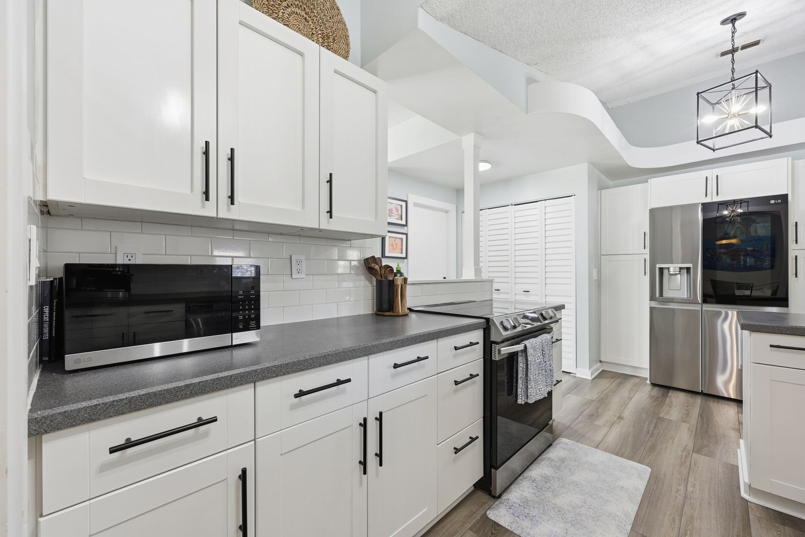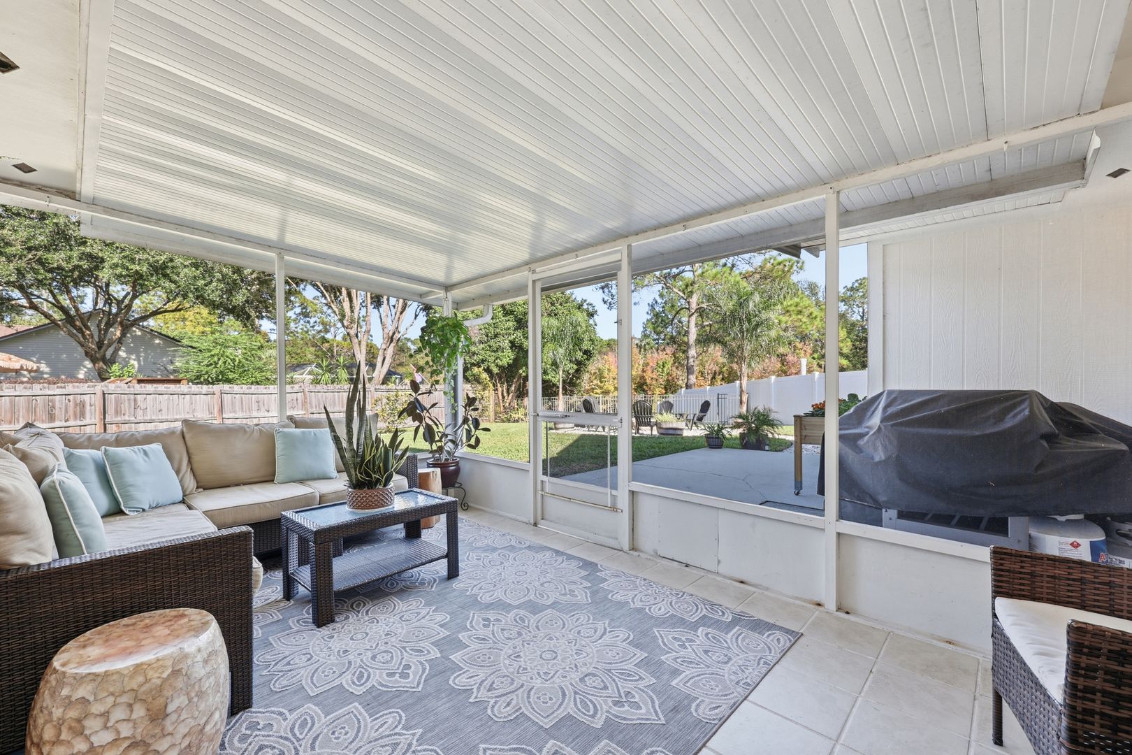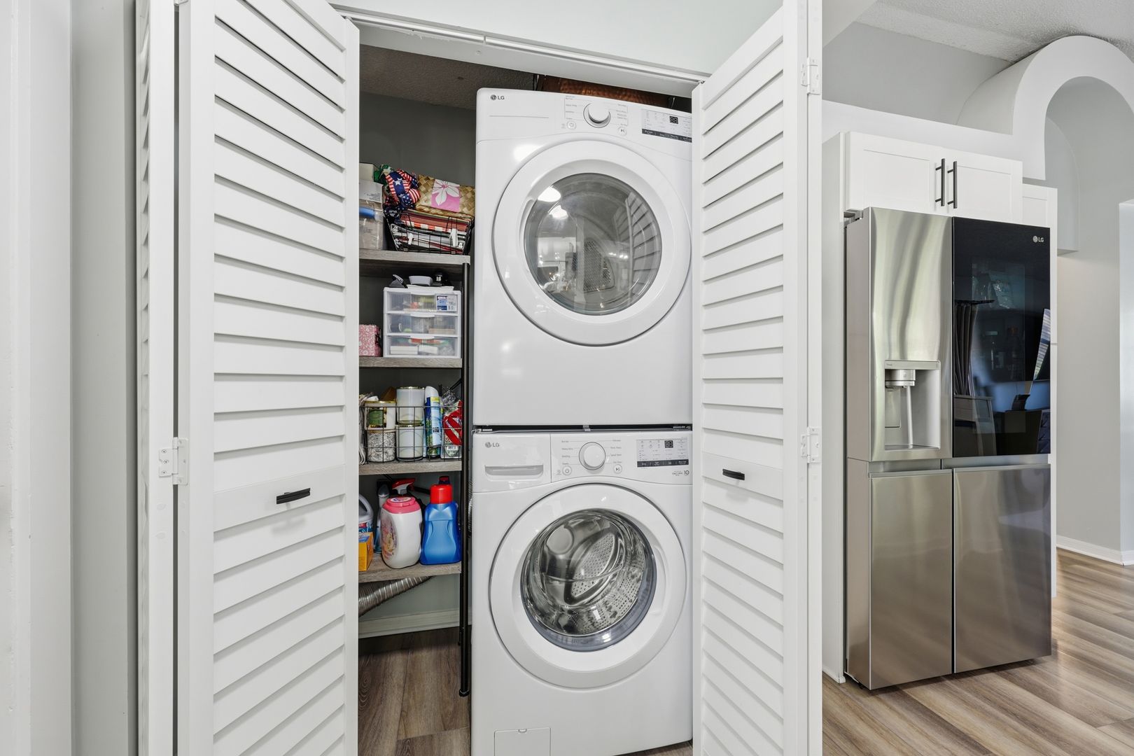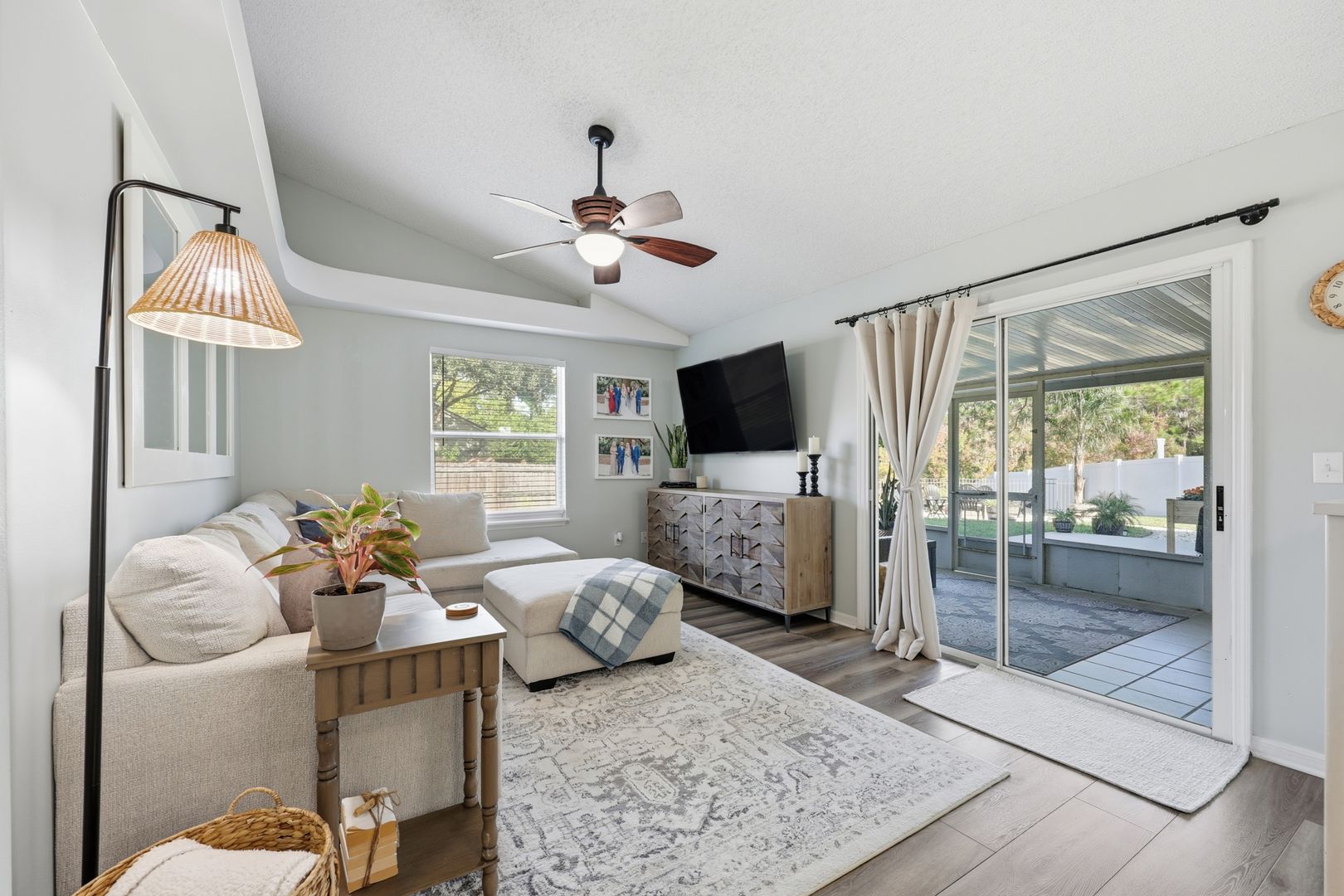 Come live on a private cul-de-sac with an enormous, fenced back yard and incredible water view! This three bedroom home has been meticulously maintained and updated over the past few years. There is durable LVP flooring throughout, beautiful light fixtures and window treatments in each room. The kitchen features a double door fridge with ice and water dispensers, electric range, dishwasher and microwave. Brand new washer and dryer with 5 year warranty. The kitchen overlooks one of two living areas and a separate, private dining area. The second living area features a built in bar with beverage cooler and extra cabinet space. This home is a split floor plan. The primary easily fits a king sized bed, walk in closet and a recently updated primary bath with newer vanity, light fixtures and a walk in shower. The other two bedrooms are located on the opposite end of the home and share a bathroom. The large screened in porch is perfect for relaxing while overlooking the massive backyard. There is a uniquely designed firepit with gravel walkway and lush greenery. Amenities in the neighborhood include a huge pool, tennis/pickleball courts, basketball courts and a playground. Call to experience this beautiful home today!