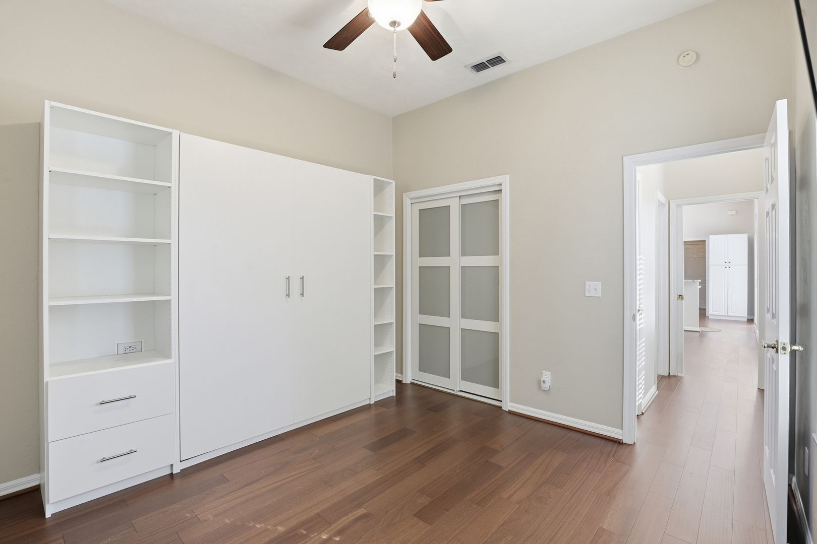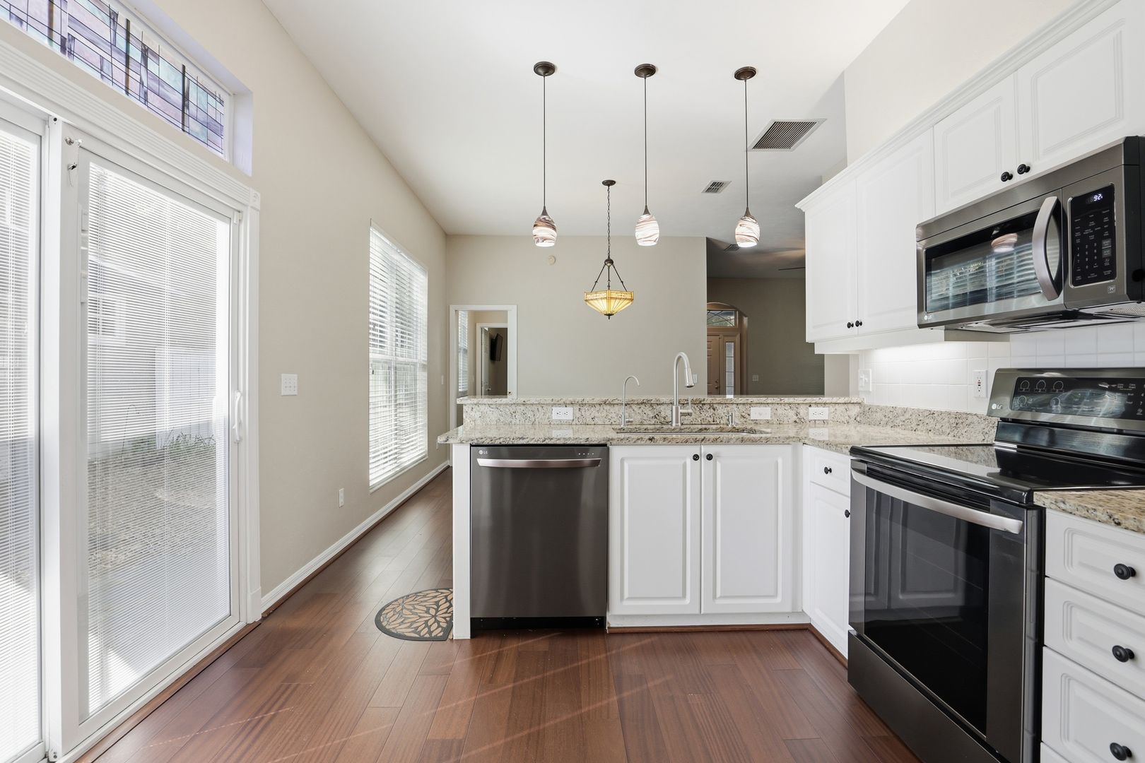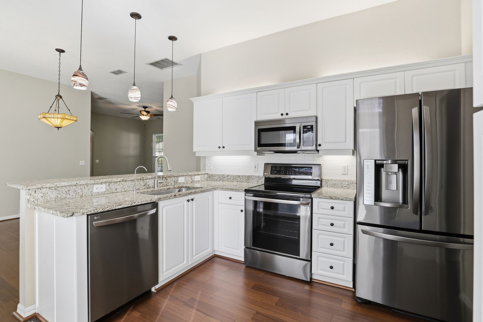 Great Haile subdivision of Chickasaw Way. Corner lot. Spacious open floor plan. Two bedroom two baths. Split bedroom plan with high ceilings. Beautiful hardwood floors. The primary bedroom is large and has a beautiful bathroom with a double sink vanity and a standalone shower. There is a large walk-in closet and a safe for tenant usage. The second bedroom has a queen size murphy bed with built in shelving. Lots of cabinet and counter space in the kitchen with stainless steel appliances including refrigerator, range, dishwasher, microwave and garbage disposal. There is a 2-car rear entry garage with stackable washer and dryer (not warranted). The side yard is privacy fenced with a nice shade.