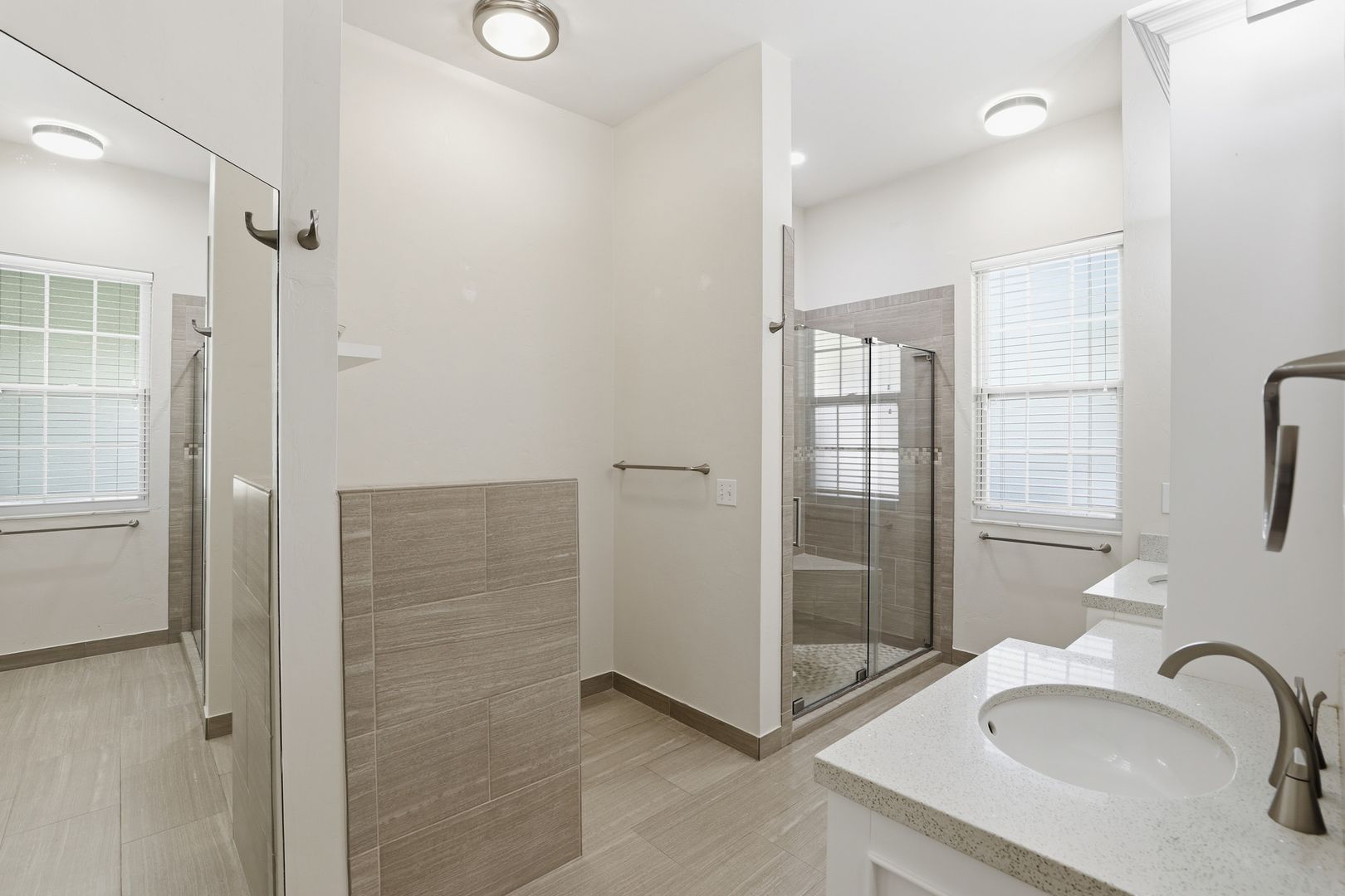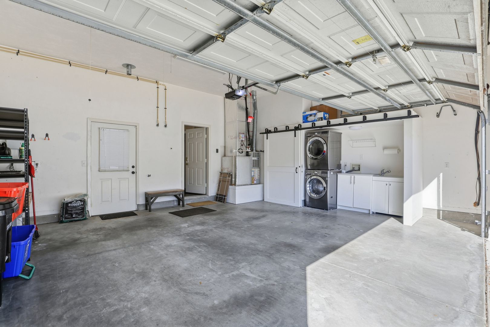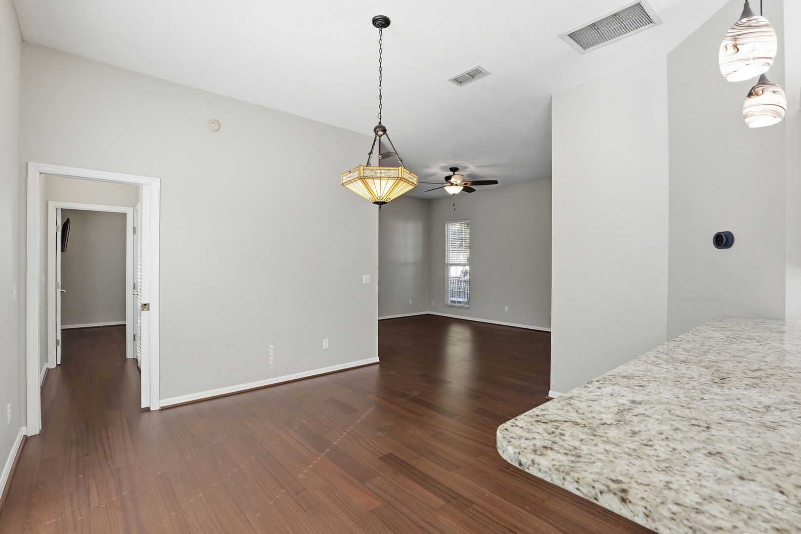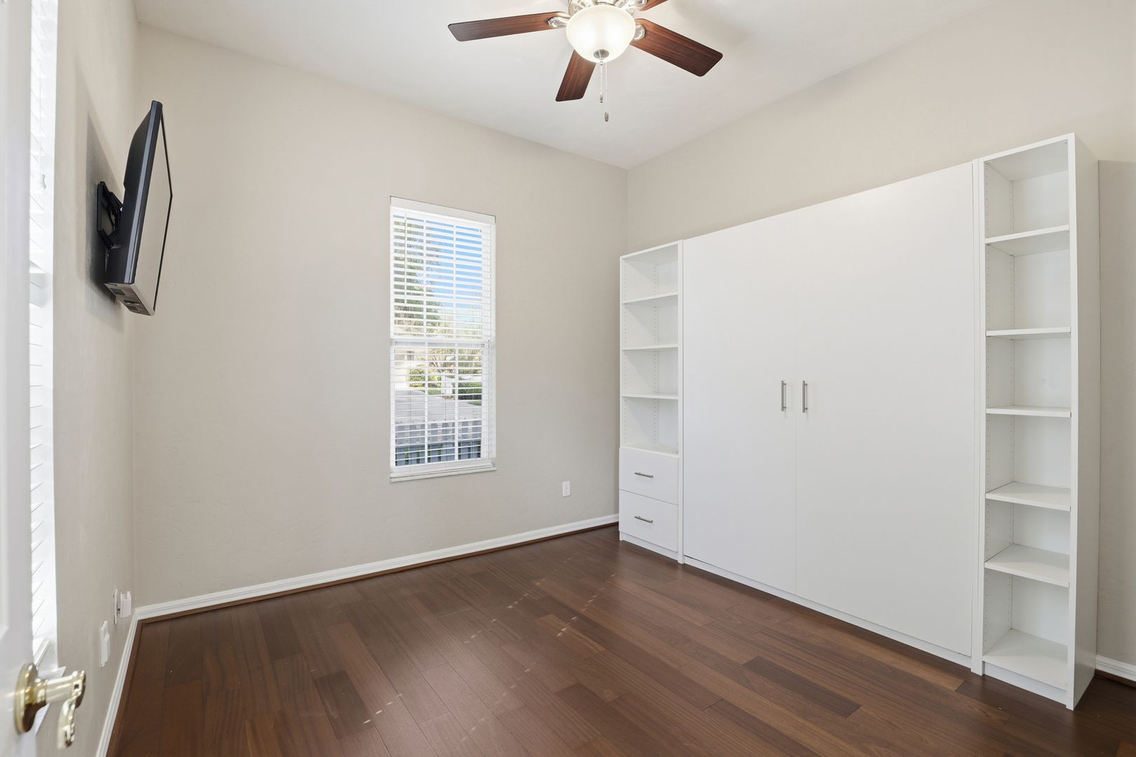 Great Haile subdivision of Chickasaw Way. Corner lot. Spacious open floor plan. Two bedroom two baths. Split bedroom plan with high ceilings. Beautiful hardwood floors. The primary bedroom is large and has a beautiful bathroom with a double sink vanity and a standalone shower. There is a large walk-in closet and a safe for tenant usage. The second bedroom has a queen size murphy bed with built in shelving. Lots of cabinet and counter space in the kitchen with stainless steel appliances including refrigerator, range, dishwasher, microwave and garbage disposal. There is a 2-car rear entry garage with stackable washer and dryer (not warranted). The side yard is privacy fenced with a nice shade.