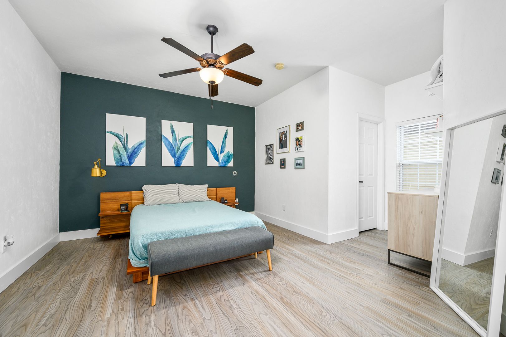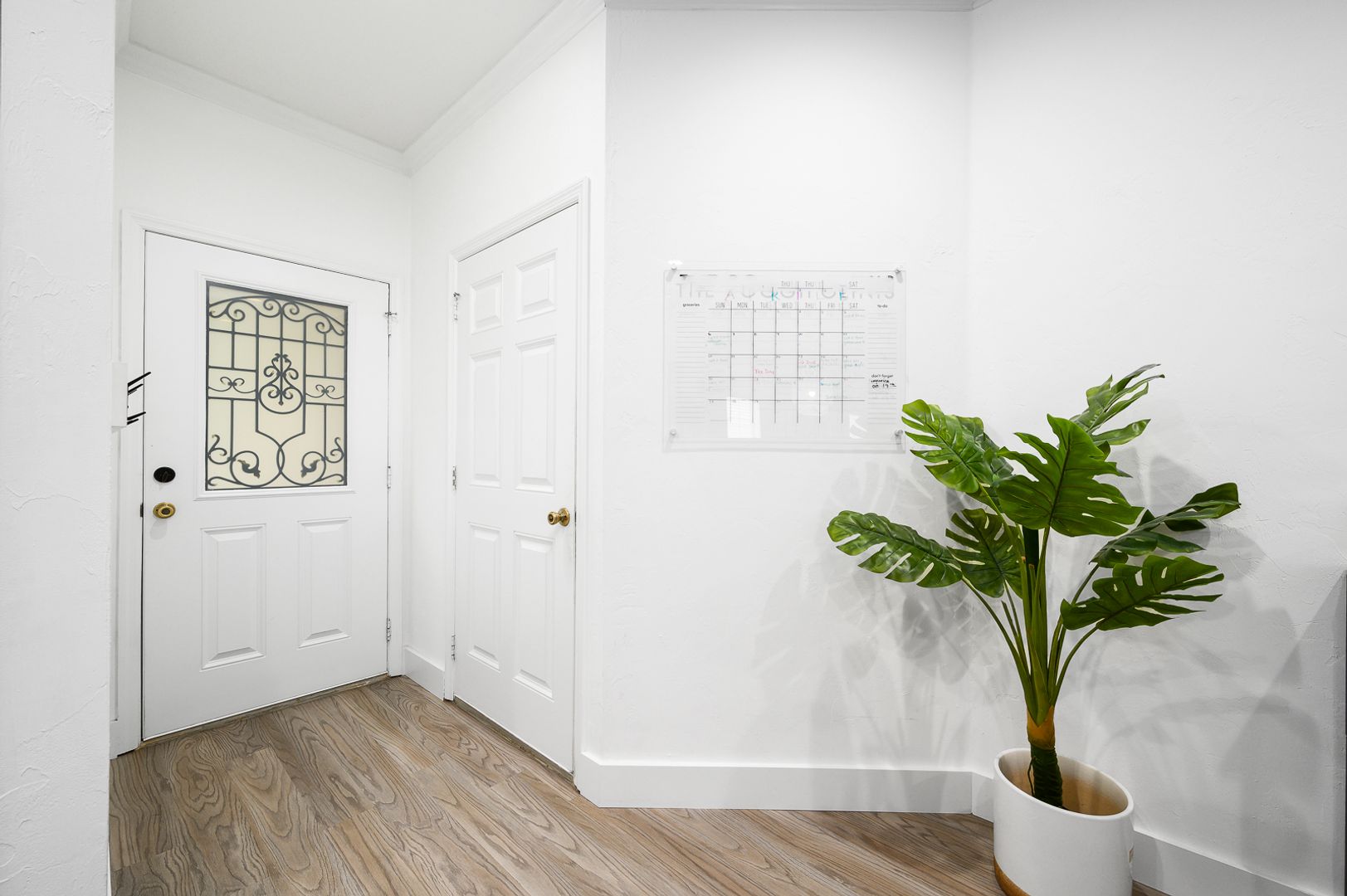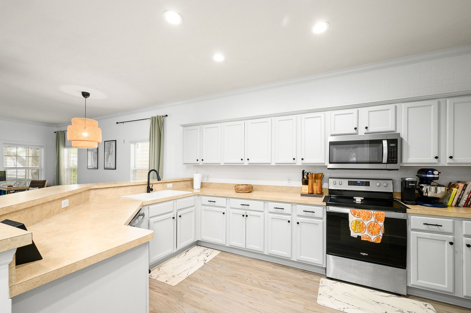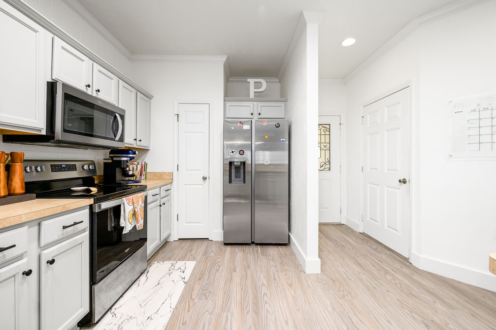 This home showcases three bedrooms and two bathrooms, adorned with elegant touches throughout. The layout flows seamlessly from the front door through the kitchen and into the open living area, which features vinyl wood plank flooring. The kitchen is particularly appealing, equipped with white cabinetry and stainless steel appliances. The master suite offers generous space, complete with a walk-in closet and an en-suite bathroom that includes both a shower and a separate tub. The two additional bedrooms, located in the hallway, share a bathroom equipped with double sinks and a tub-shower combination.