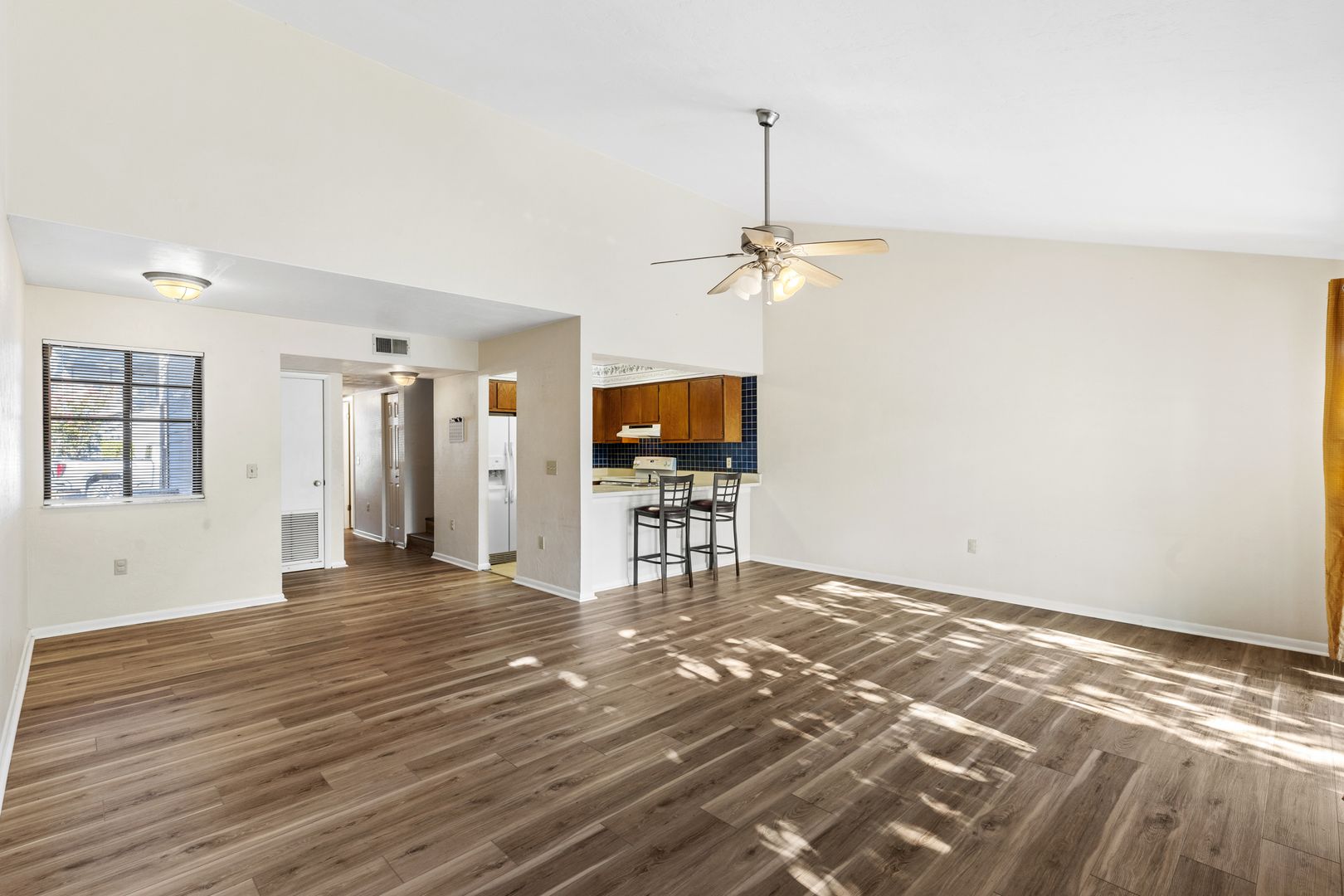 The vaulted ceilings create an open and airy layout, perfect for relaxation or entertaining. The home boasts new luxury vinyl flooring throughout, providing a fresh and modern ambiance. The kitchen features blue ceramic tile backsplash, wood cabinetry, with a gas range, refrigerator, dishwasher and garbage disposal. Enjoy the charming breakfast bar, perfect for quick meals or savoring your morning coffee. The bright living area seamlessly extends to the backyard, where a small patio awaits—ideal for setting up outdoor furniture to unwind after a long day of school or work while enjoying the fresh air and natural surroundings.