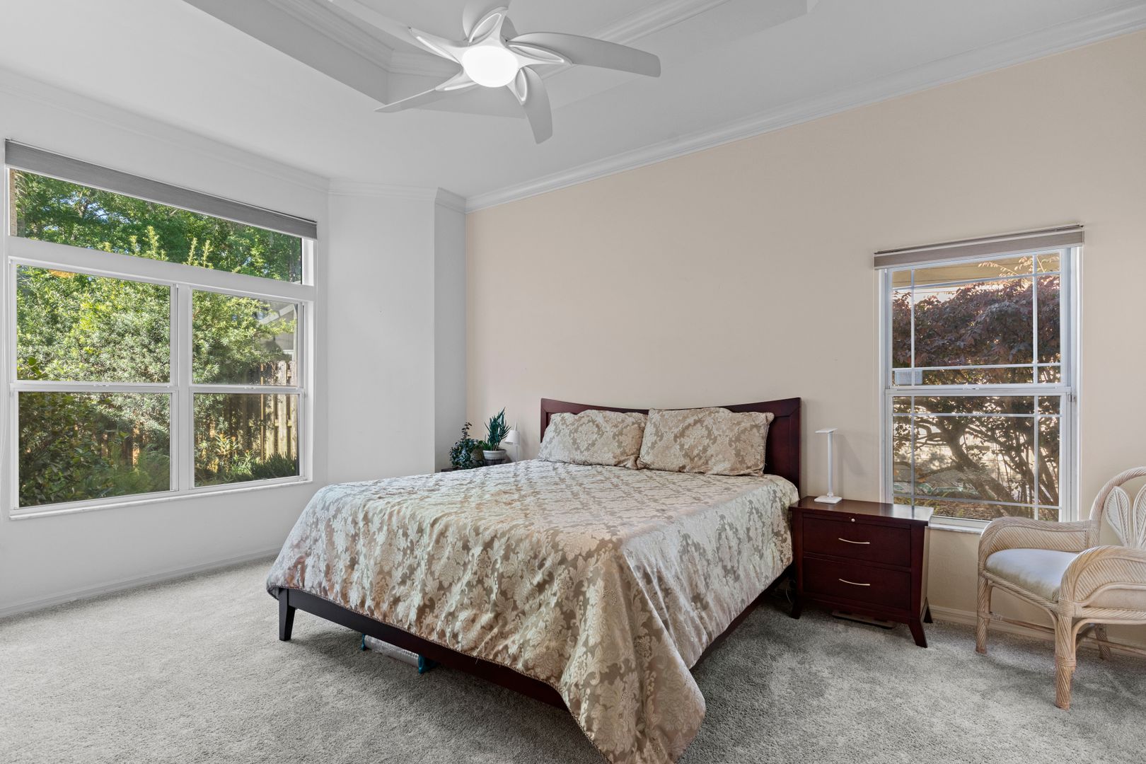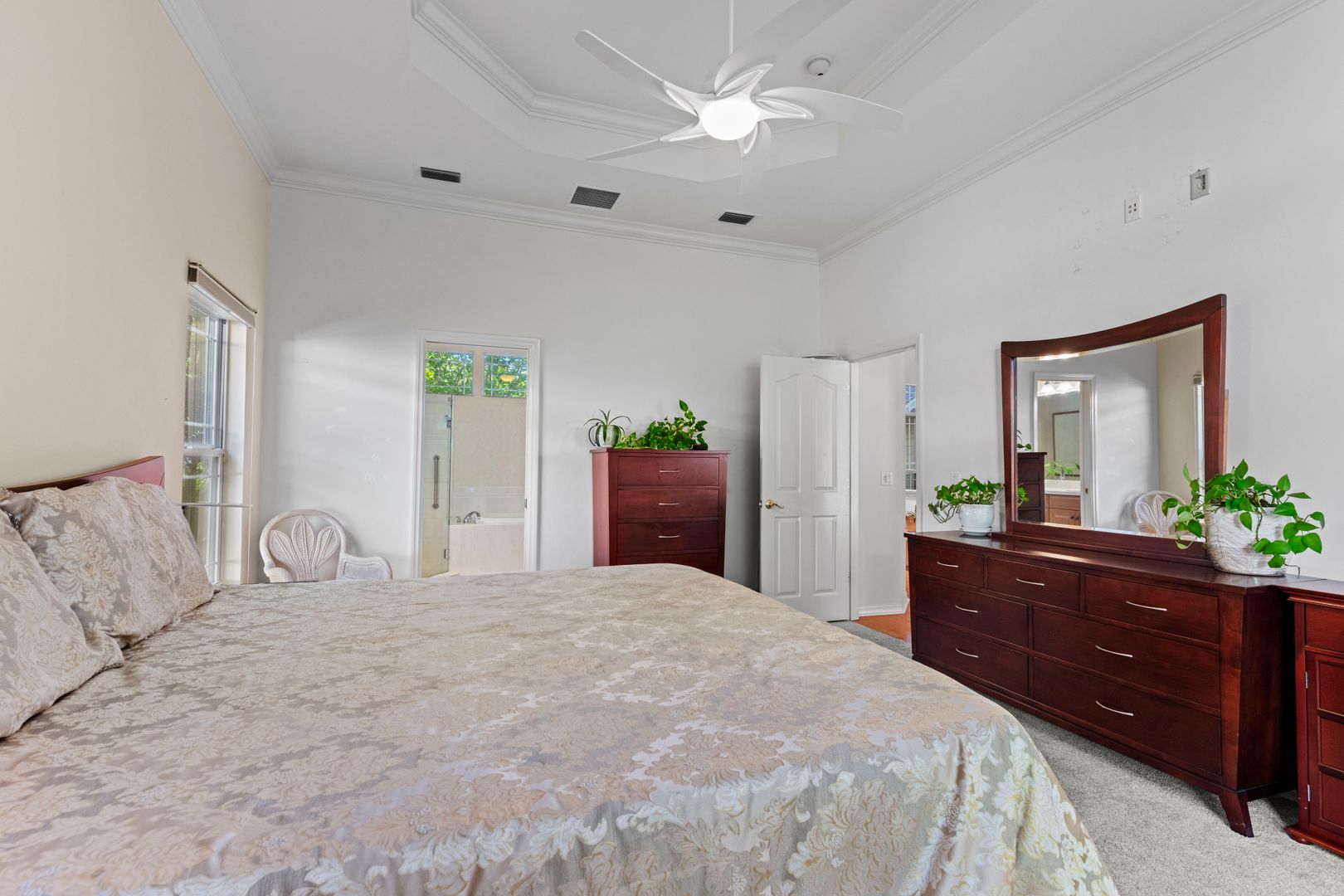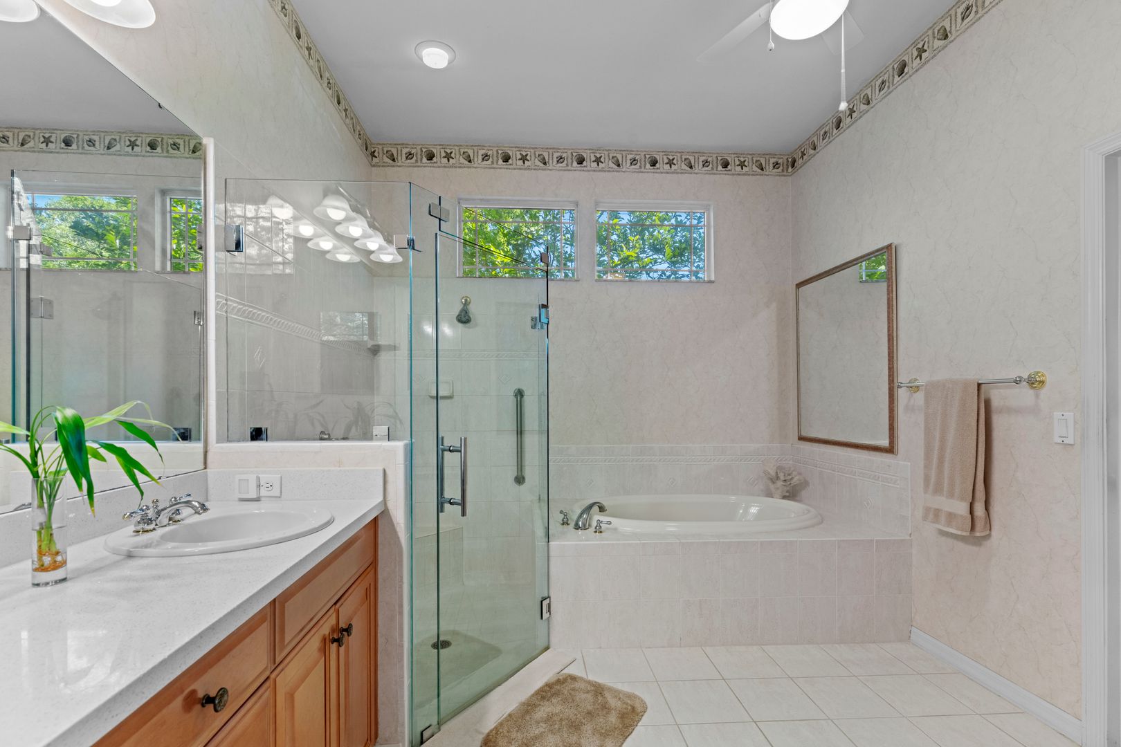 The great room is highlighted by a charming gas fireplace and opens to a spacious conditioned sunroom. Elegant wood flooring extends throughout the common areas, while the bedrooms are carpeted. The expansive master suite includes a newly remodeled bathroom, complete with a walk-in shower, a jetted tub, and a large vanity featuring double sinks. Additionally, the master suite offers a generous walk-in closet.