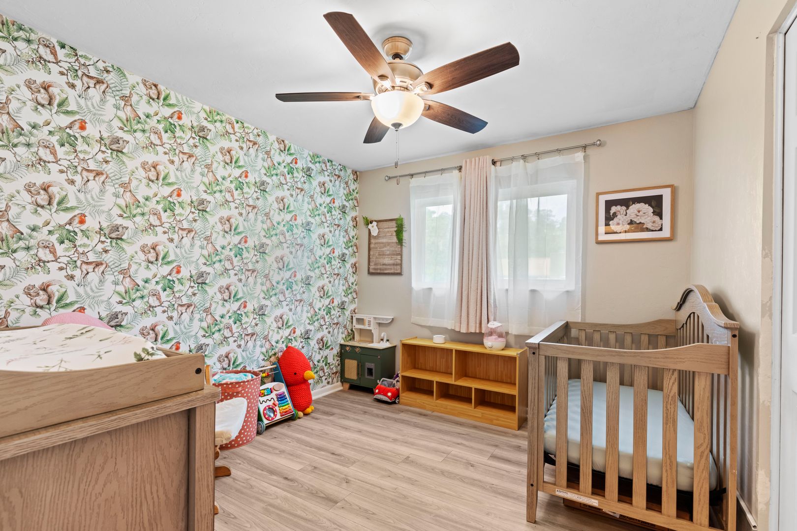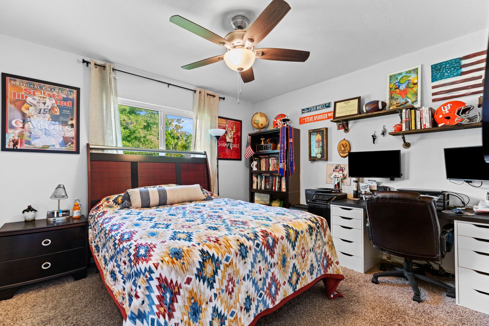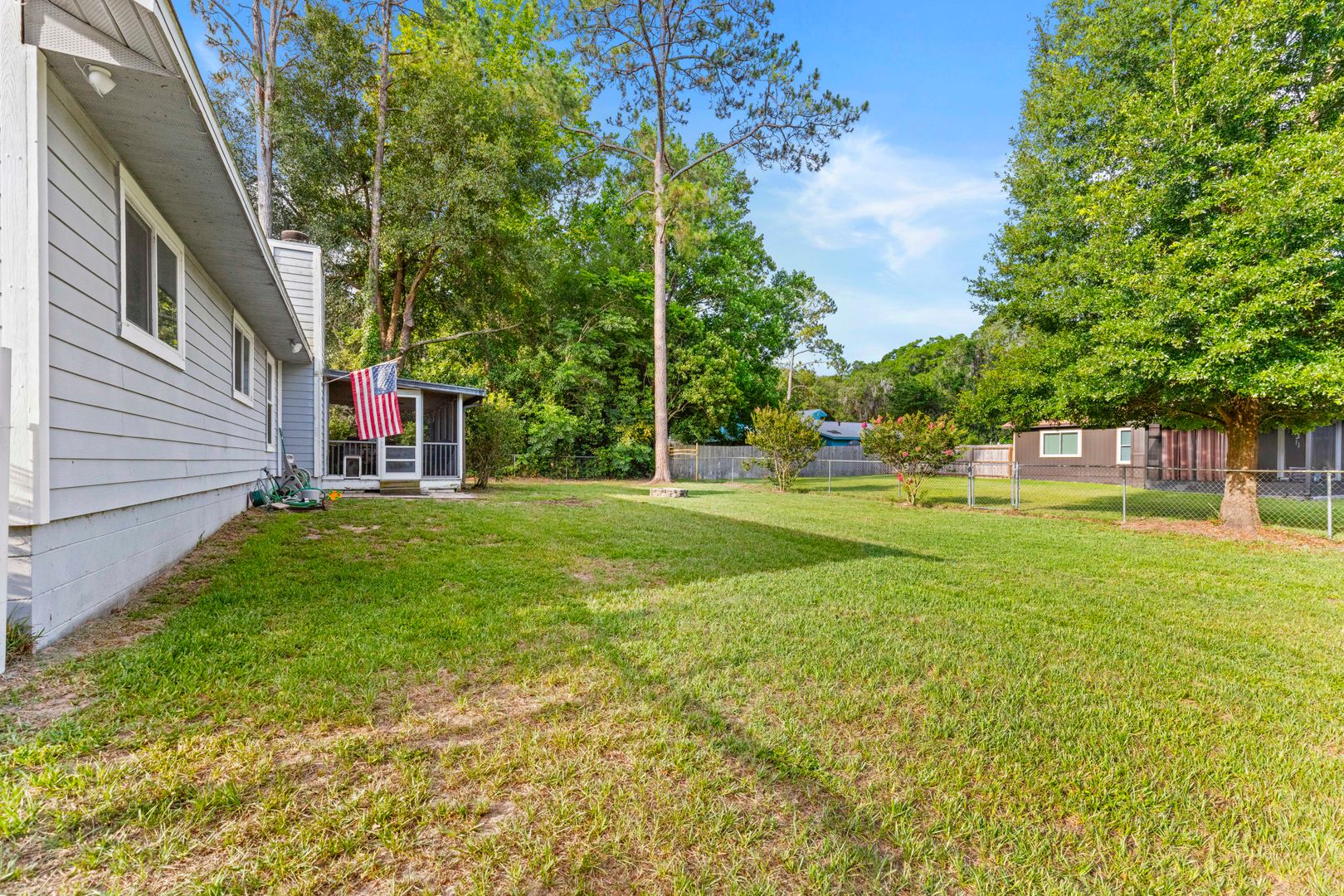 Accessible from the living area is a screened-in patio that offers ample space for outdoor furniture and is equipped with two ceiling fans for enhanced circulation. This area is perfect for gatherings and overlooks a fully fenced yard, providing extensive space for outdoor activities, ensuring a safe play environment for children and pets.