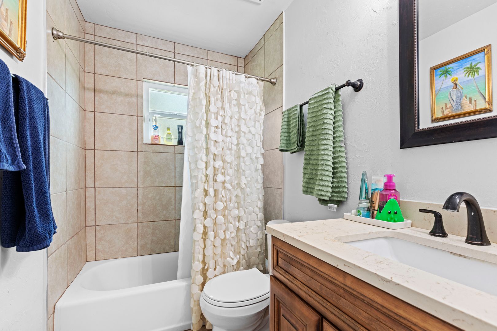 This home features a split floor plan. The owner’s suite is generously sized and provides direct access to the screened-in back patio. The master bathroom has been tastefully remodeled in neutral tawny tones, featuring a step-in shower. On the opposite side of the home, two additional bedrooms are found—one with carpeting and the other with vinyl plank flooring, alongside a full bathroom that has also been remodeled in neutral tawny tones.