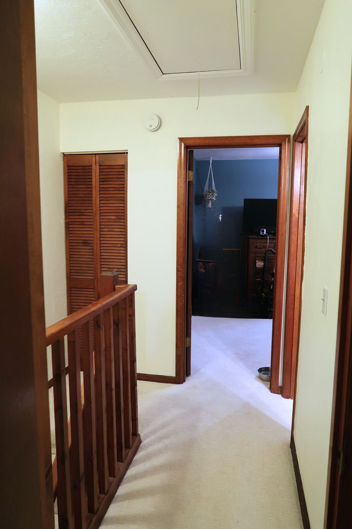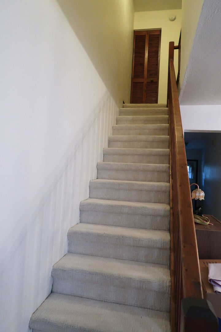 Upstairs, you will find the primary bedroom, which boasts a bay window, vaulted ceilings, and an en-suite bathroom, alongside a second bedroom and a hall bath. The carpet throughout the upstairs rooms and hallway is both durable and stain-resistant, presented in a neutral beige tone. Townhouse also includes a security system for your peace of mind.