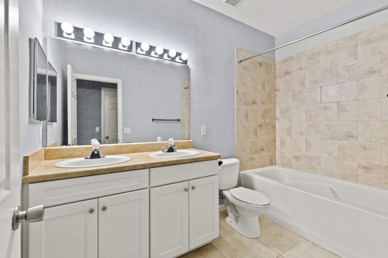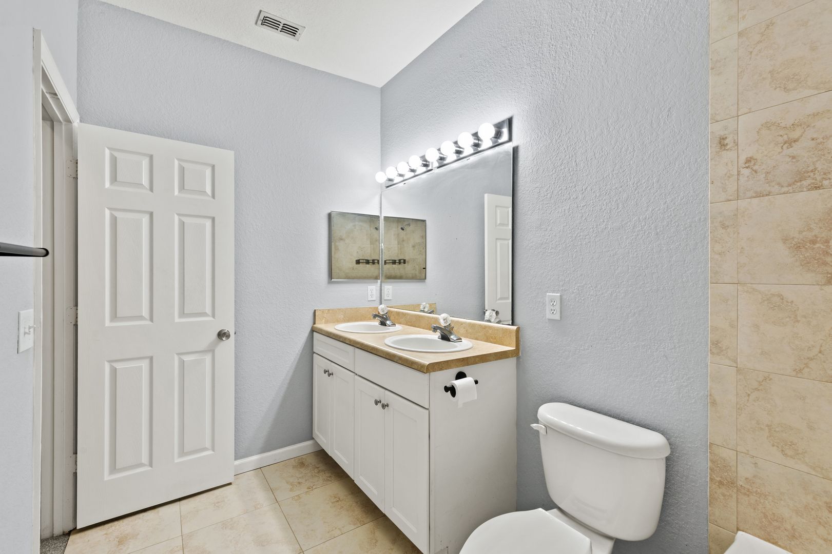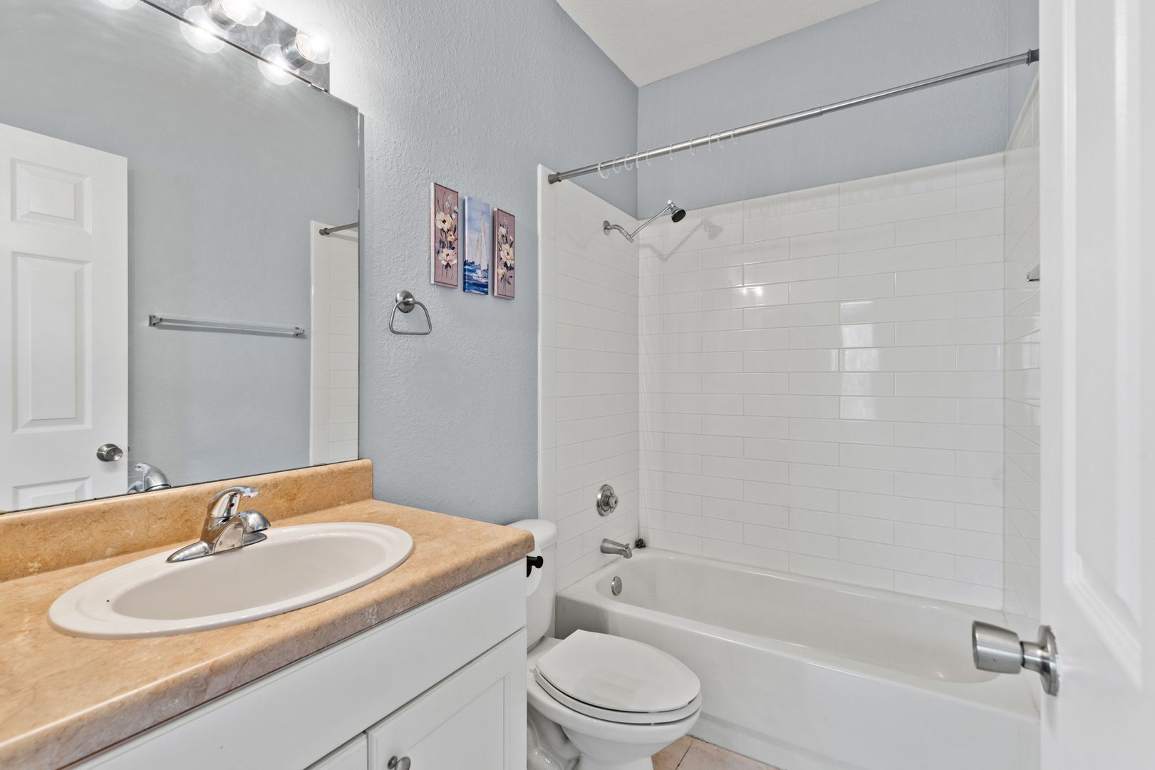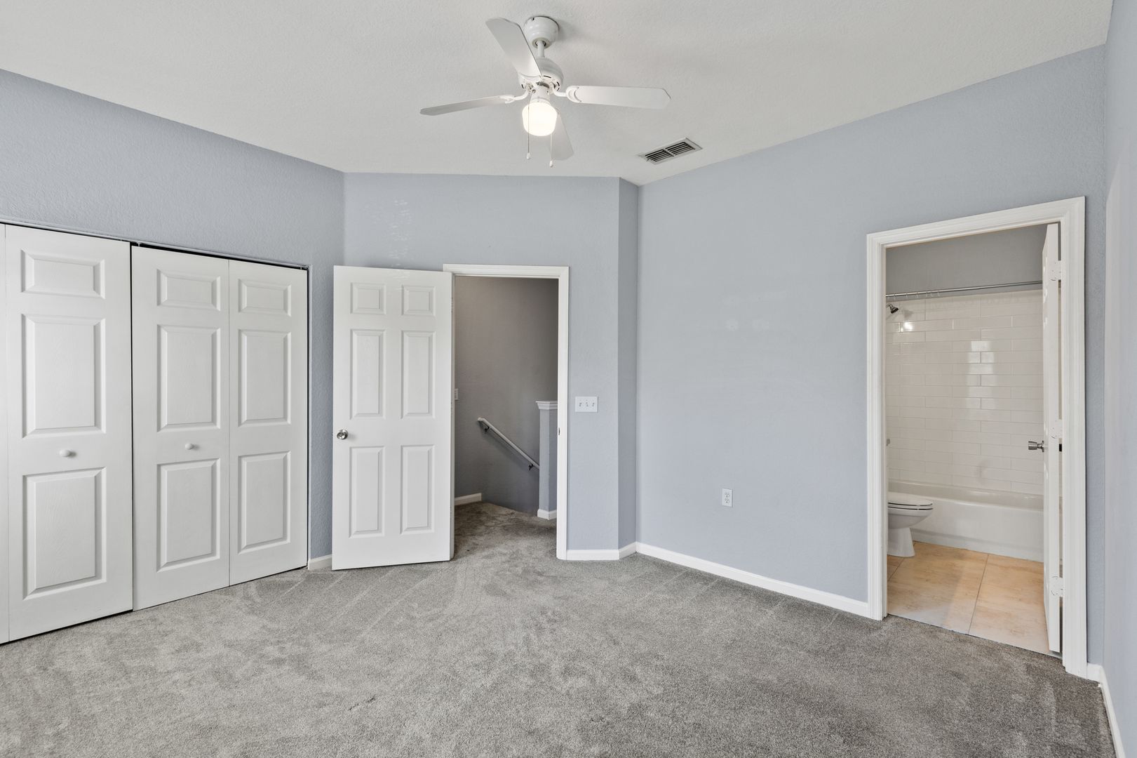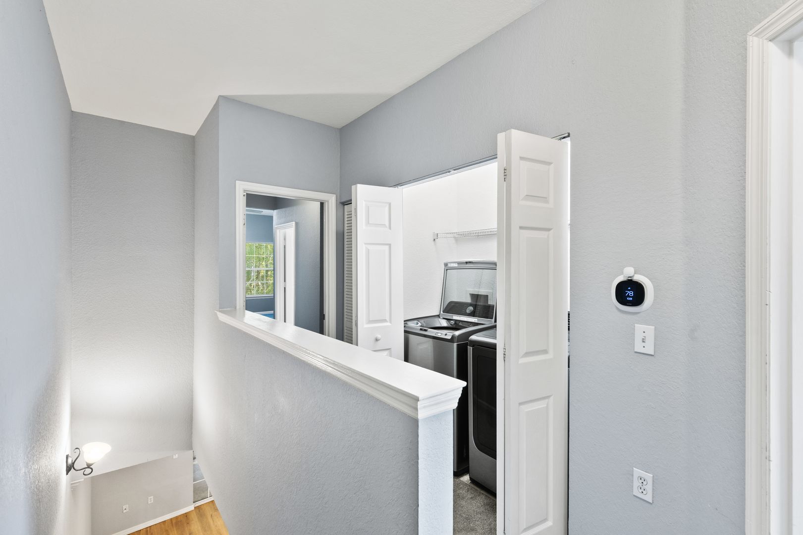 The carpeted stairs lead to the second story, where two spacious bedrooms and bathrooms await. The bedrooms are carpeted, while the bathrooms boast tiled floors. Also conveniently located in the upstairs hallway is a laundry closet complete with a washer and dryer, which are not warranted.