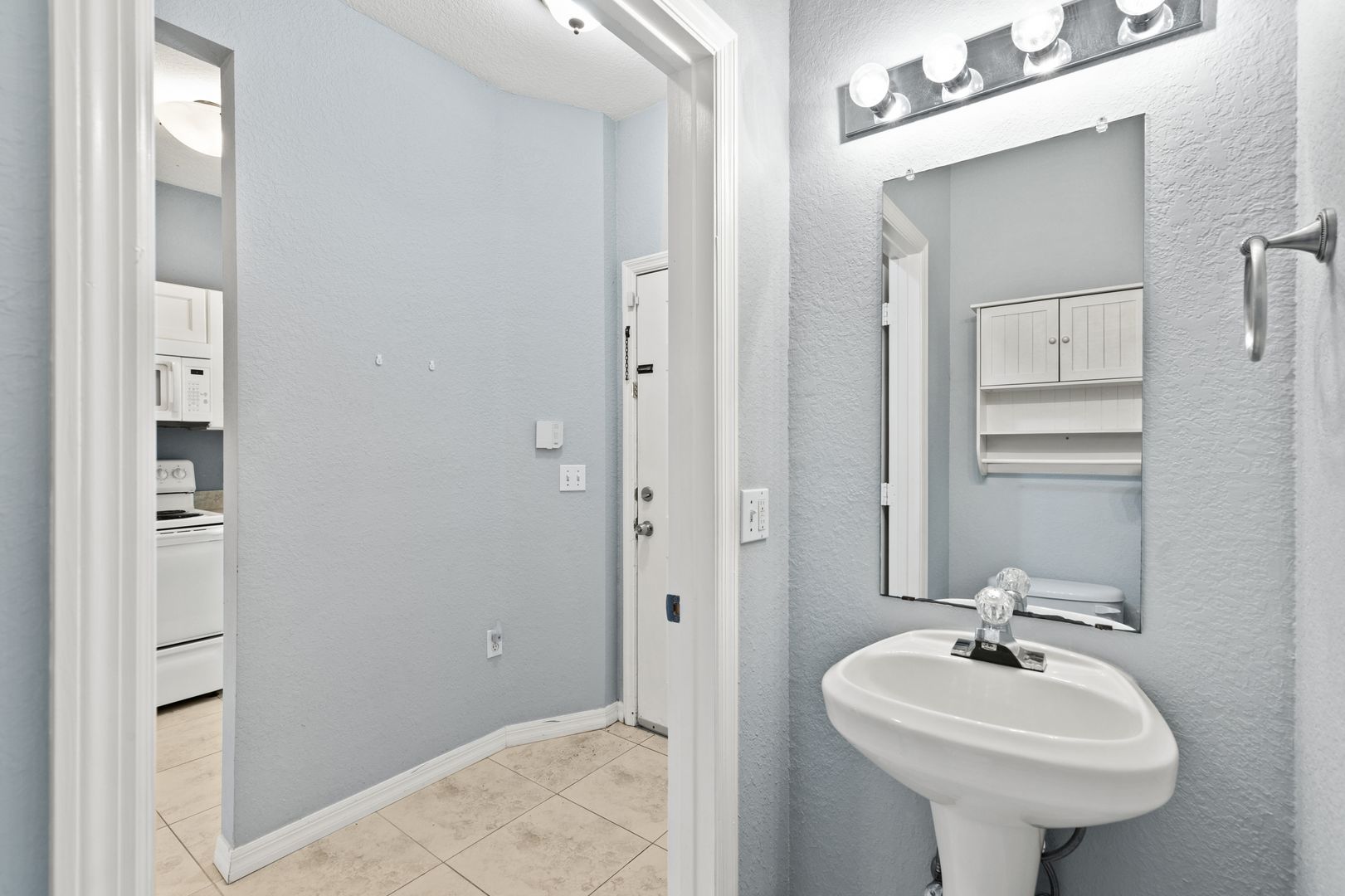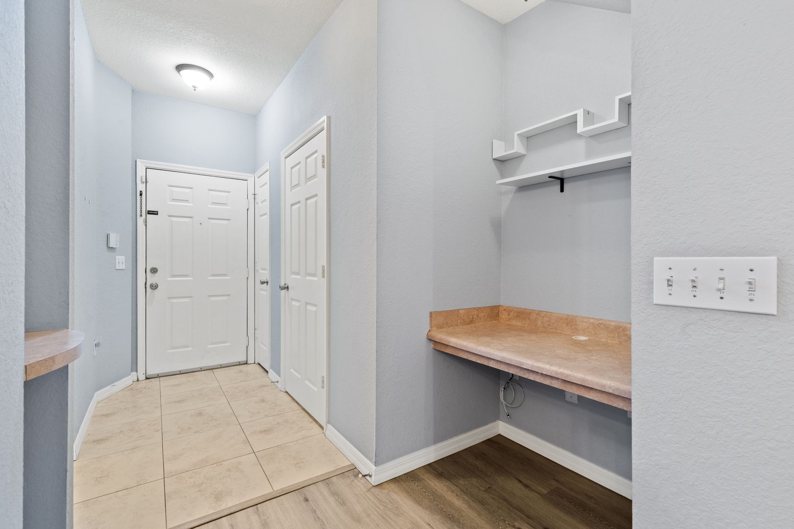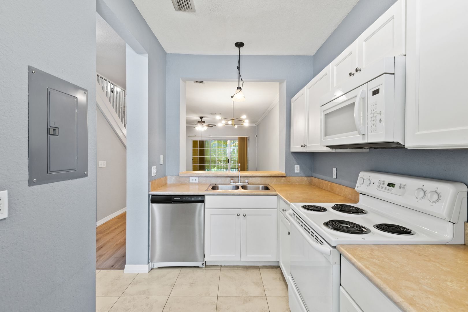 This picturesque two-bedroom, two-and-a-half-bath townhome in Magnolia Place is ready for you to call it home. Upon entering, you are greeted by ceramic tile and stylish vinyl plank flooring. The downstairs living area features a bright kitchen equipped with white appliances and cabinetry, complemented by a convenient breakfast bar. Additionally, there is a built-in computer desk, a guest bathroom, and the living area opens to a private porch, ideal for sipping coffee and enjoying the local wildlife.